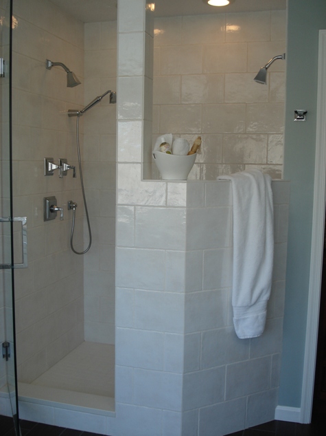 The new open concept shower now affords the couple with unobstructed views to the world outside without having to be right next to a window for all the world to see! Double shower heads, chrome fixtures, and the clean crisp white tiles seamlessly blend modern and traditional, making it appeal to almost anyone. The half-wall is the perfect spot for storing shampoo, bath gel, or hanging your towel.